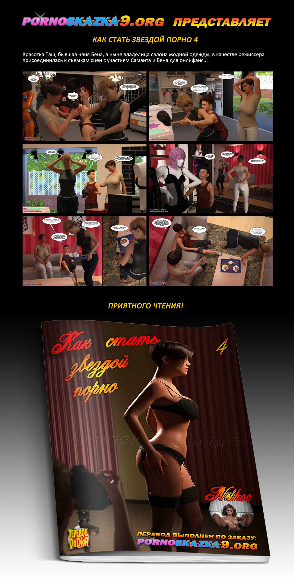 Порно комикс «Как стать звездой порно. Часть 4.» Красотка Таш, бывшая няня Бена, а ныне владелица салона модной одежды, в качестве режиссера присоединилась к съемкам сцен с участием Саманта и Бена для онлифанс…